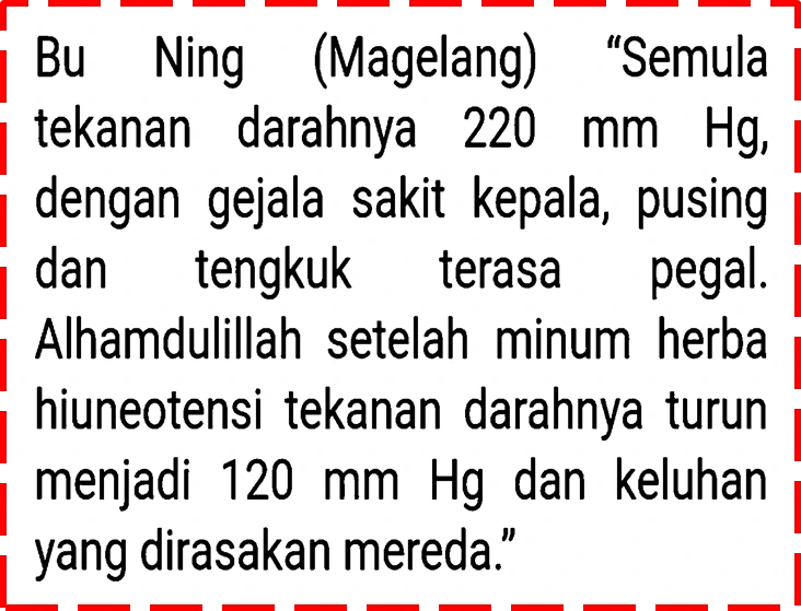- Meredakan gejala-gejala hipertensi seperti tidak nyaman pada tengkuk, sakit kepala, kelelahan, sulit tidur, gelisah, berdebar, telinga berdenging, rasa pegal, terkadang mual, muntah, dan sesak nafas.